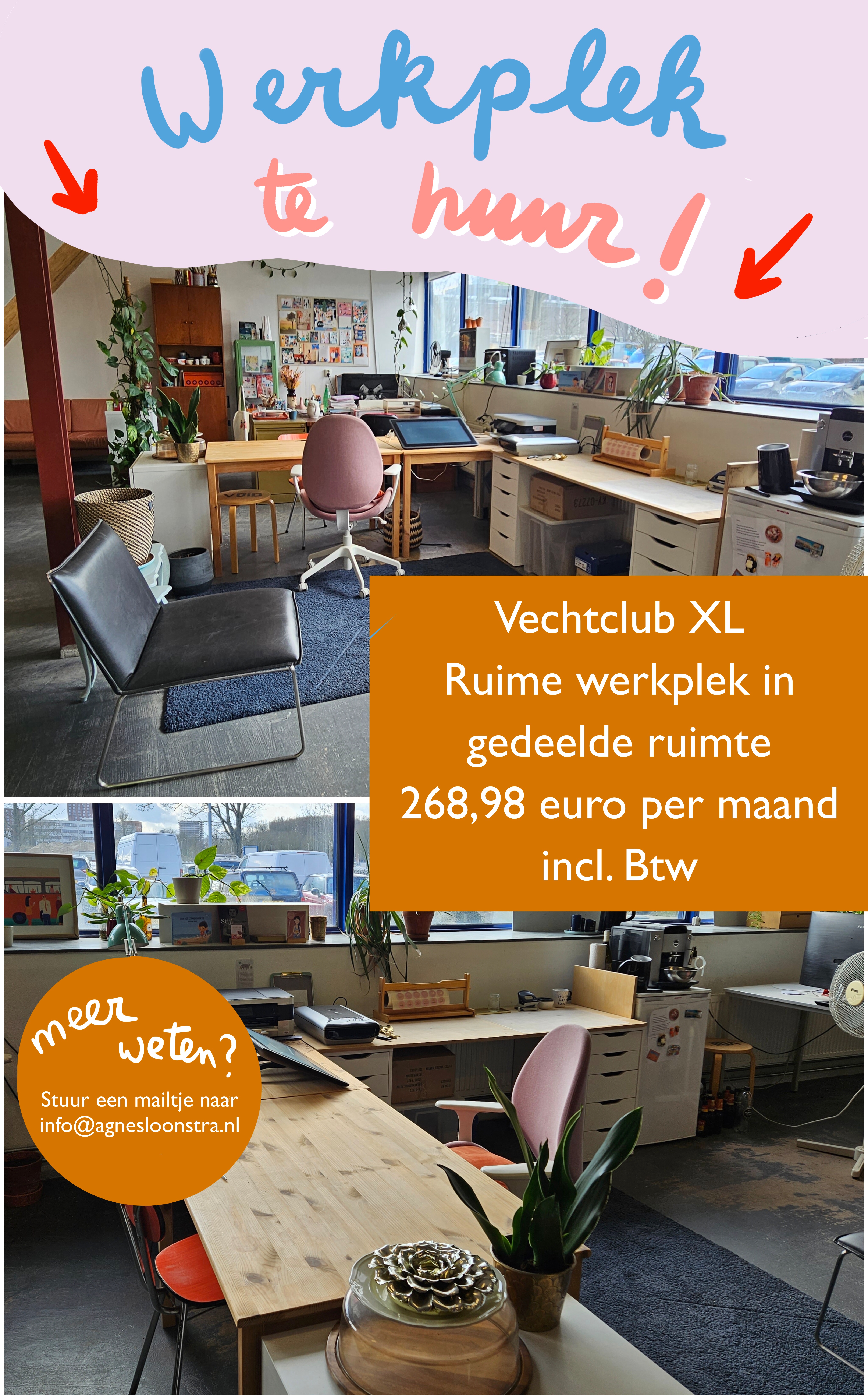 Bij ons in de ruimte in Vechtclub XL komt er een fijne, lichte werkplek bij het raam vrij. Het is een grote ruimte met 10 werkplekken voor creatieve ZZP'ers. Mooie mix van lekker kunnen werken én gezelligheid op een bruisende hotspot in de stad met veel cultureel en sociaal aanbod. 268,98 euro per maand incl. btw.